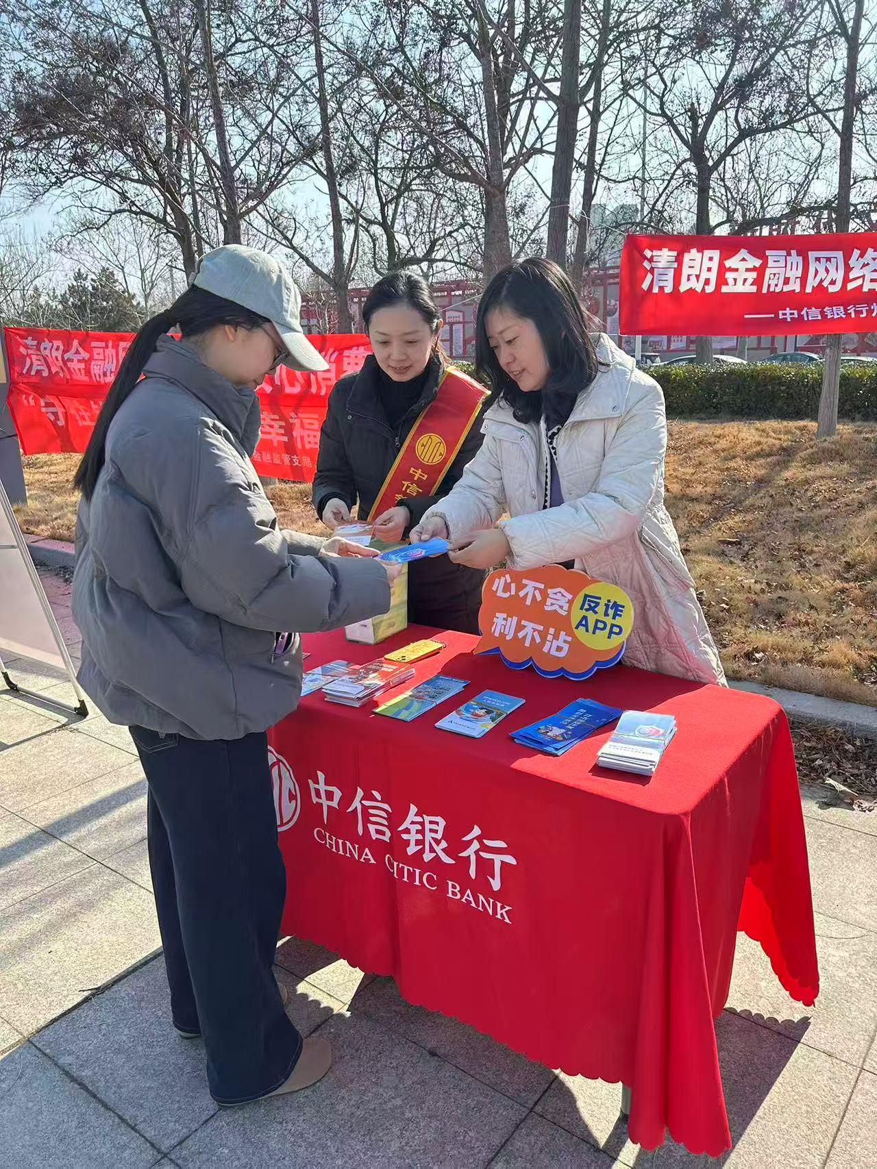 多场景覆盖,筑牢全民防线。中信银行各网点组织宣传队伍,深入商圈市场、企业园区等区域,通过设摊宣讲、案例讲解、情景互动、反诈问答等形式,揭露电信诈骗、非法代理退保、虚假理财、过度索权等风险套路。联合志愿团体一起走入养老机构,献爱心宣讲金融知识,帮助老年群体跨越“数字鸿沟”。
